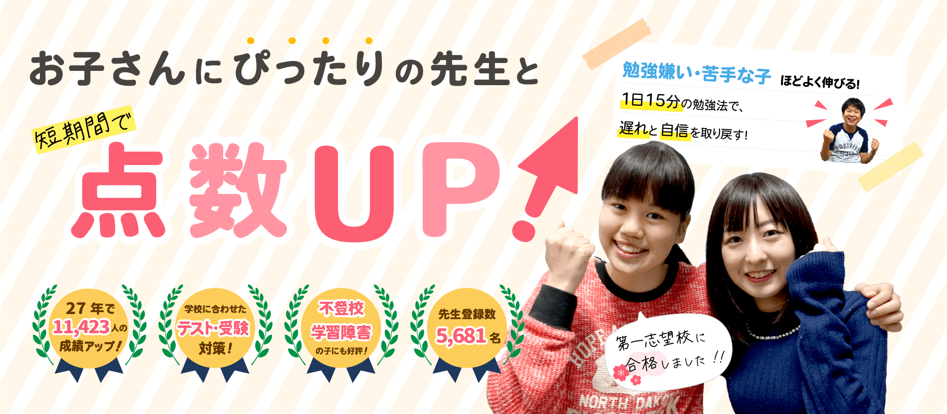 勉強が大嫌いな子でも「1日15分」で簡単に続けられる予習復習法で、お子さんの苦手をしぼって授業を「わかる!おもしろい!」に変えます!